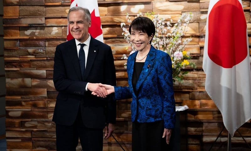 Canadian Prime Minister Mark Carney meets Japanese Prime Minister Sanae Takaichi in Tokyo during his Indo-Pacific tour, where the two countries elevated their relationship to a Comprehensive Strategic Partnership | Photo shared by Carney on X